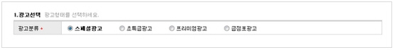 우선 1번 항목은 광고의 선택입니다. 왼쪽에 있는 스페셜광고가 3개월 간 110만원으로 가장 높은 가격입니다. 이외 3가지가 더 있는데 등록하시는 분의 자금 사정에 맞춰 광고를 선택하시면 됩니다. 초특급은 66만원, 프리미엄은 22만원, 급점포는 6만6000원입니다. 모두 부가세 포함입니다.